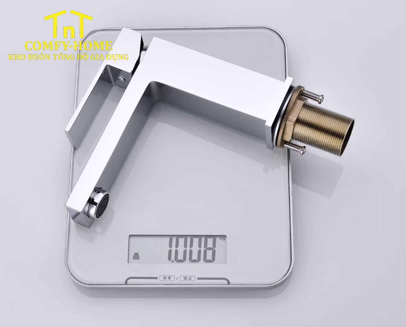 • Chất liệu đồng thau dày dặn: Trọng lượng thân vòi đạt mức 1.008 kg, chứng minh cho độ dày của cốt đồng bên trong, giúp sản phẩm chịu được áp lực nước lớn và có độ bền vượt trội theo thời gian.
